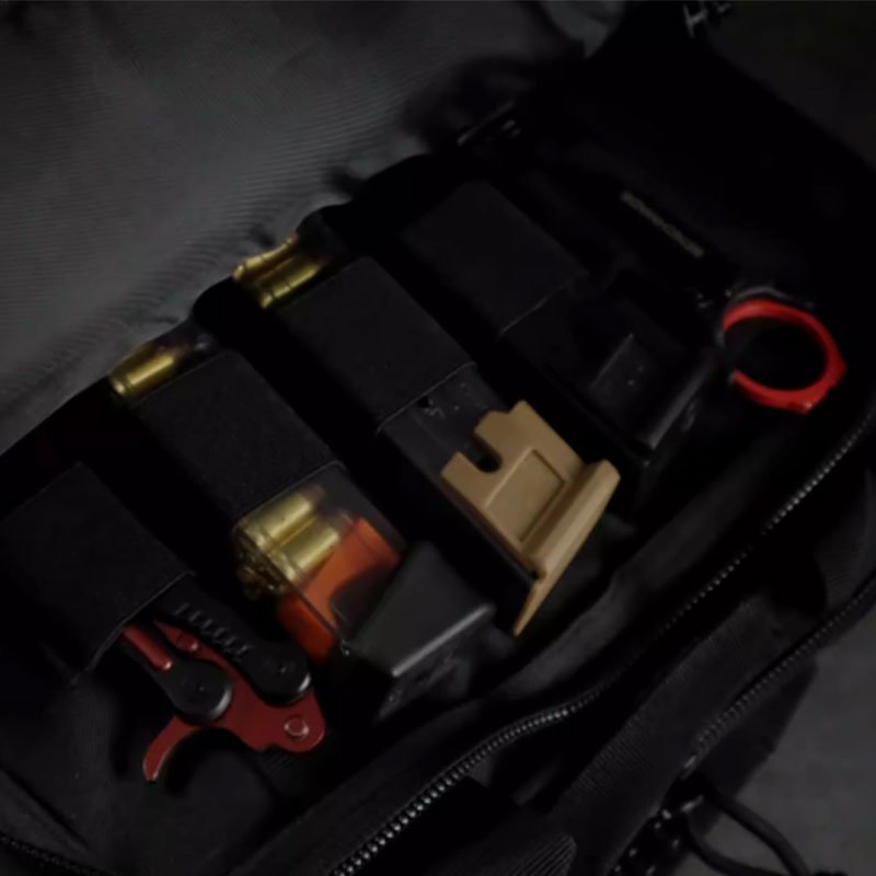 tactical gun duffle bag has a built-in removable Velcro slot base that can be used to secure firearms while traveling.