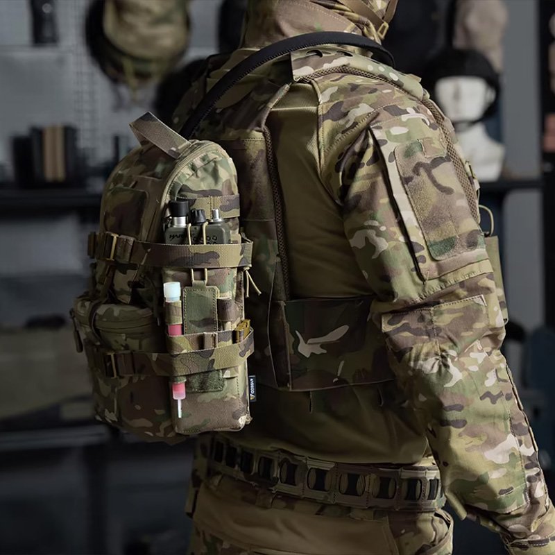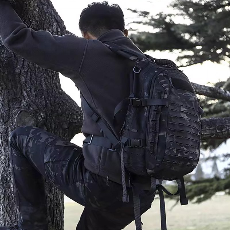 The entire body of the backpack is covered with a MOLLE system and Velcro modules, allowing for flexible adjustment of gear configuration and the attachment of unit insignia, thereby increasing tactical utility.